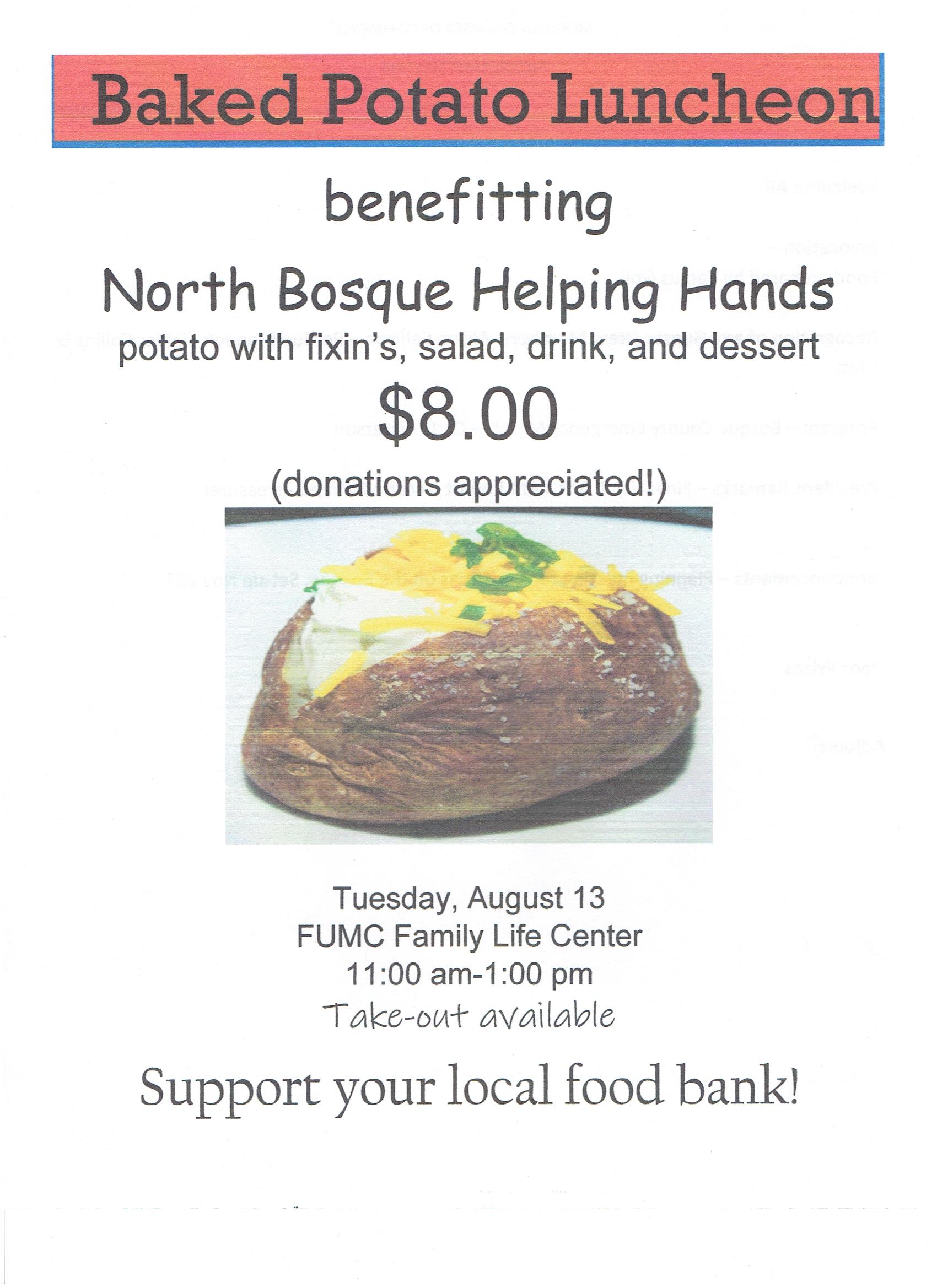 Baked Potato Luncheon Calendar Add to Calendar Add to Timely Calendar Add to Google Add to Outlook Add to Apple Calendar Add to other calendar Export to XML When: August 13, 2019 @ 11:00 AM – 1:00 PM 2019-08-13T11:00:00-05:00 2019-08-13T13:00:00-05:00 Where: First United Methodist Church 300 N. Main Meridian TX. 76665 Cost: 8.00 Charity Community Baked Potato dessert food pantry lunch