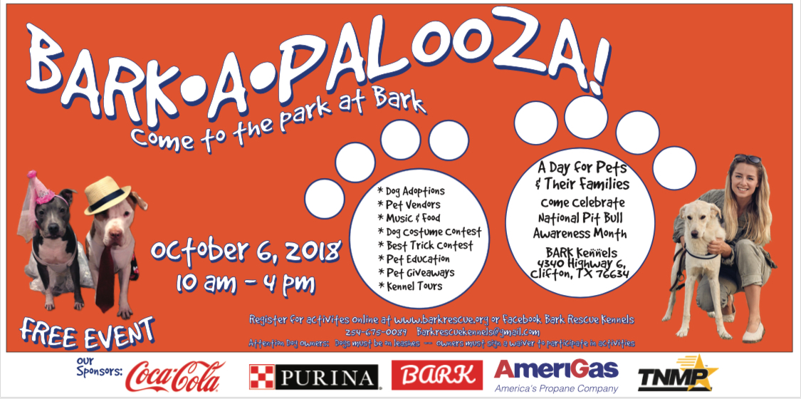 BARK-A-Palooza Calendar Add to Calendar Add to Timely Calendar Add to Google Add to Outlook Add to Apple Calendar Add to other calendar Export to XML When: October 6, 2018 @ 10:00 AM – 4:00 PM 2018-10-06T10:00:00-05:00 2018-10-06T16:00:00-05:00 Where: BARK Park Clifton TX 76634 USA Cost: Free Animal Rescue Charity Community Family Fun