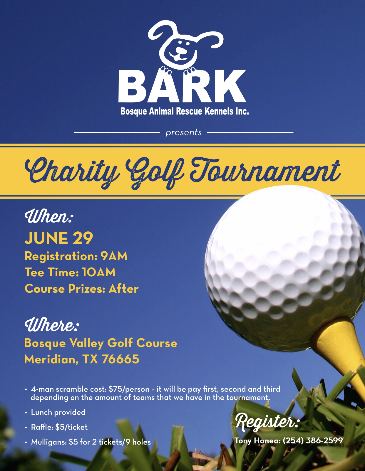 BARK Charity Golf Tournament Calendar Add to Calendar Add to Timely Calendar Add to Google Add to Outlook Add to Apple Calendar Add to other calendar Export to XML When: June 29, 2019 @ 9:00 AM – 2:00 PM 2019-06-29T09:00:00-05:00 2019-06-29T14:00:00-05:00 Where: Bosque Valley Golf Course Contact: Tony Honea 254-386-2599 Charity Community 4 man scramble BARK raffle rescue dogs