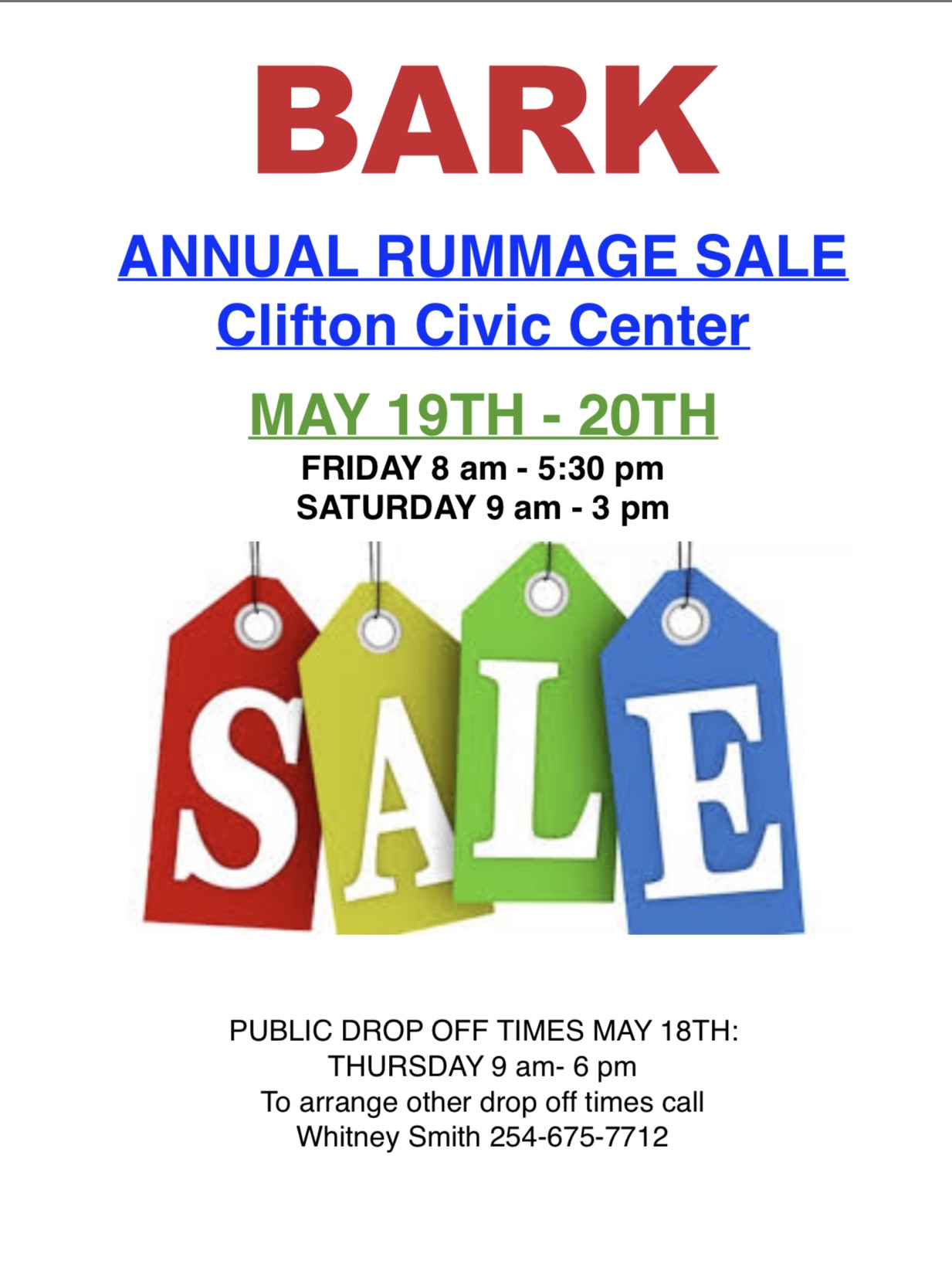 BARK Fall Rummage Sale Calendar Add to Calendar Add to Timely Calendar Add to Google Add to Outlook Add to Apple Calendar Add to other calendar Export to XML When: October 27, 2017 @ 8:00 AM – October 28, 2017 @ 5:30 PM 2017-10-27T08:00:00-05:00 2017-10-28T17:30:00-05:00 Where: Clifton Civic Center Contact: Whitney Smith 254-675-7712 Charity Community animal rescue Bosque Cale garage sale pet adoption SEEKING DONATIONS PUBLIC DROP OFF Oct. 26 Thursday 9am – 6 pm PLEASE NO ELECTRONICS OR CLOTHING