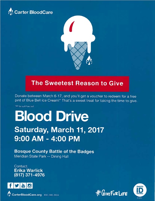 ***Battle of the Badge Blood Drive*** Calendar Add to Calendar Add to Timely Calendar Add to Google Add to Outlook Add to Apple Calendar Add to other calendar Export to XML When: March 11, 2017 @ 9:00 AM – 4:00 PM 2017-03-11T09:00:00-06:00 2017-03-11T16:00:00-06:00 Where: Meridian State Park Meridian State Park 173 Park Road #7, Meridian, TX 76665 United States Cost: Free Contact: Erika Warlick 2544352536 Community Family Fun blood drive Bosque ems Free entry Meridian police dept State Park VFD