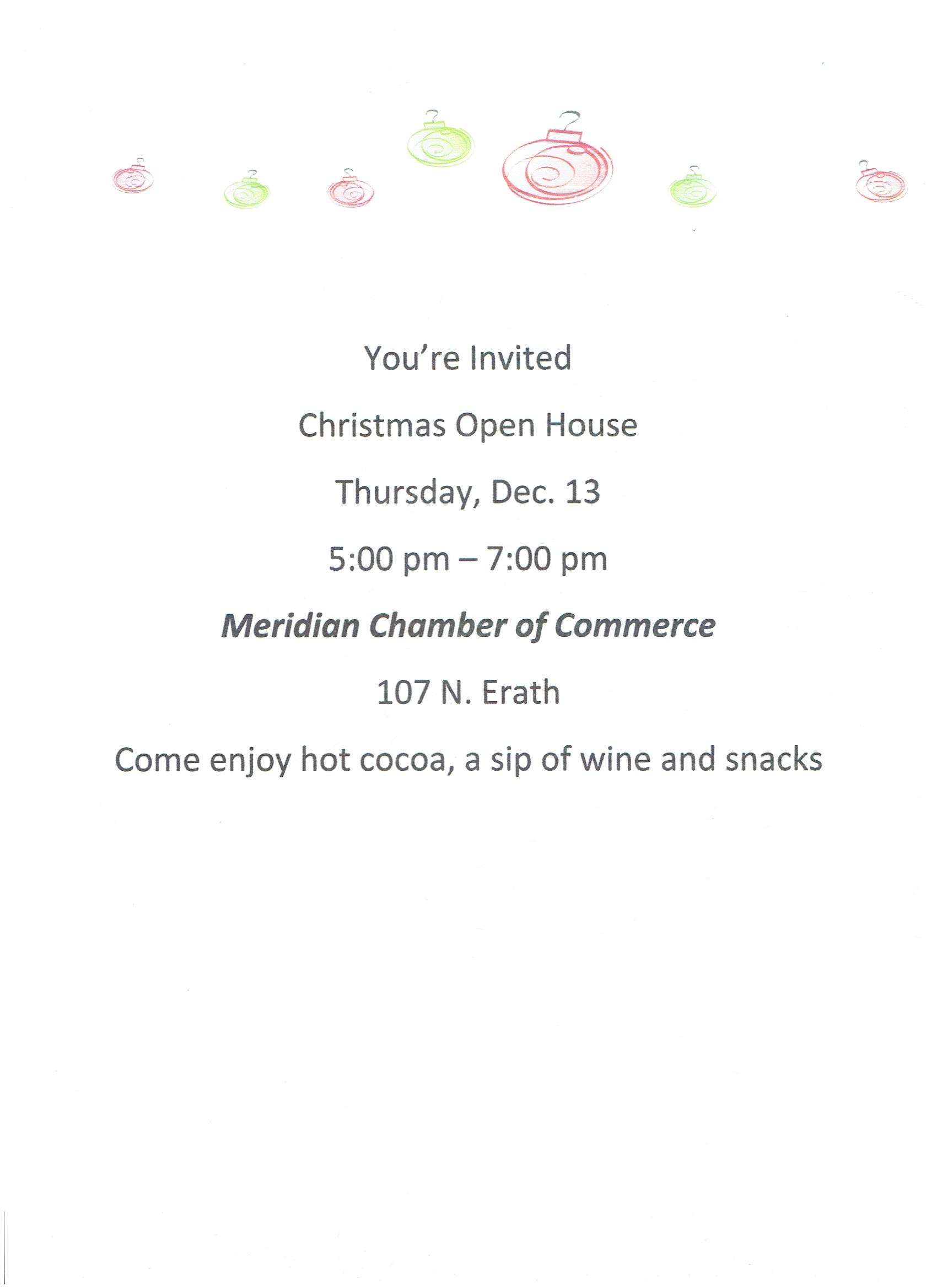 Chamber of Commerce Open House Calendar Add to Calendar Add to Timely Calendar Add to Google Add to Outlook Add to Apple Calendar Add to other calendar Export to XML When: December 13, 2018 @ 5:00 PM – 7:00 PM 2018-12-13T17:00:00-06:00 2018-12-13T19:00:00-06:00 Community open house Details to follow