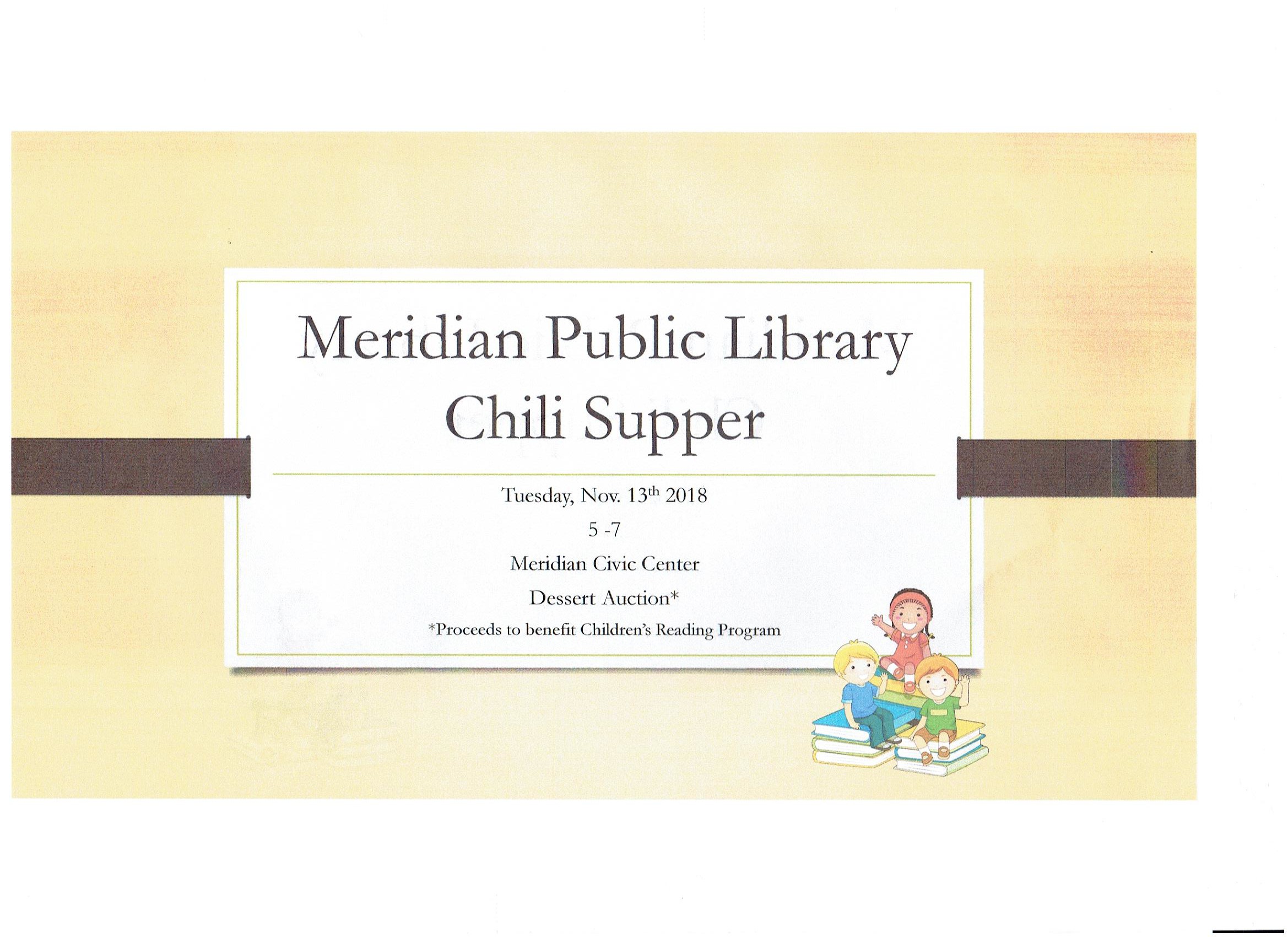 Library Chili Supper Calendar Add to Calendar Add to Timely Calendar Add to Google Add to Outlook Add to Apple Calendar Add to other calendar Export to XML When: November 13, 2018 @ 5:00 PM – 7:00 PM 2018-11-13T17:00:00-06:00 2018-11-13T19:00:00-06:00 Where: Meridian Civic Center Community Family Fun chili library reading