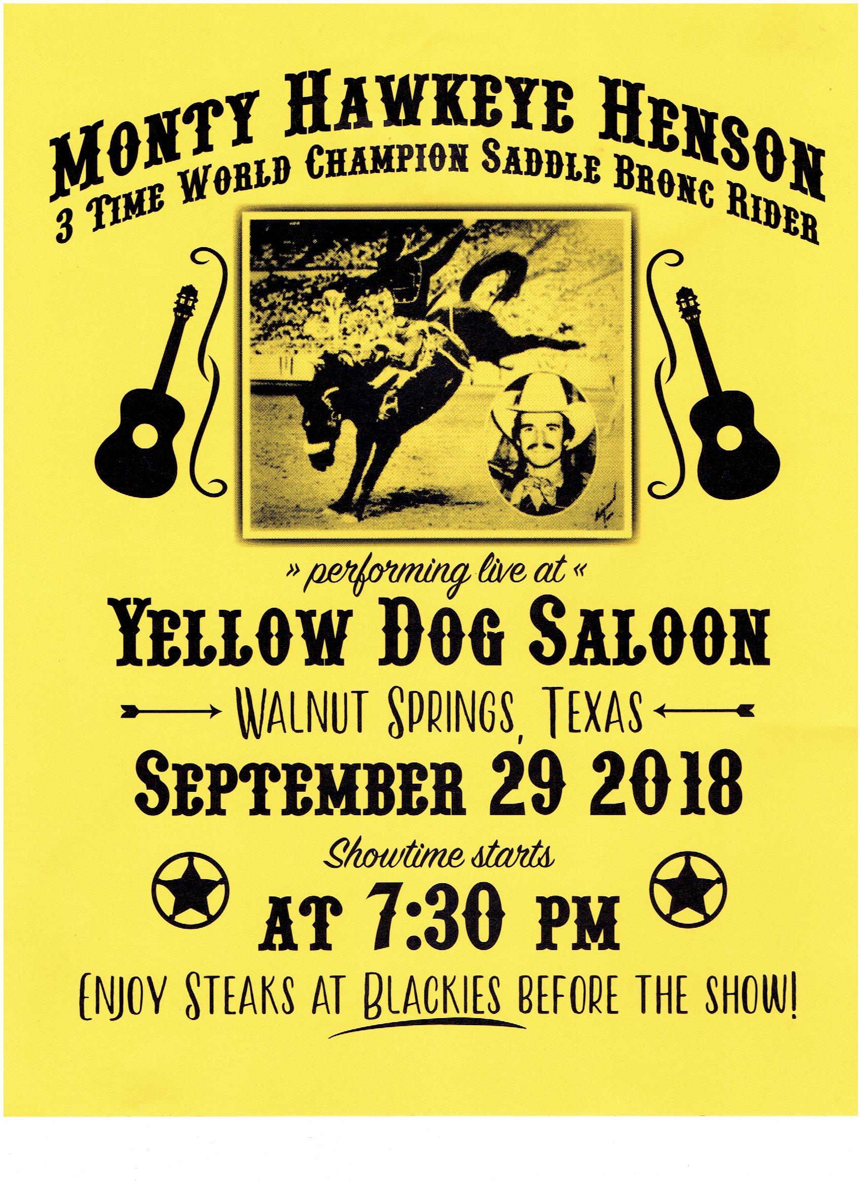 Monty Hawkeye Henson performing live at “Yellow Dog Saloon” Calendar Add to Calendar Add to Timely Calendar Add to Google Add to Outlook Add to Apple Calendar Add to other calendar Export to XML When: September 29, 2018 @ 7:30 PM – 10:00 PM 2018-09-29T19:30:00-05:00 2018-09-29T22:00:00-05:00 Where: Yellow Dog Saloon Walnut Springs TX 76690 USA LIVE Entertainment live music saddle bronc rider steaks