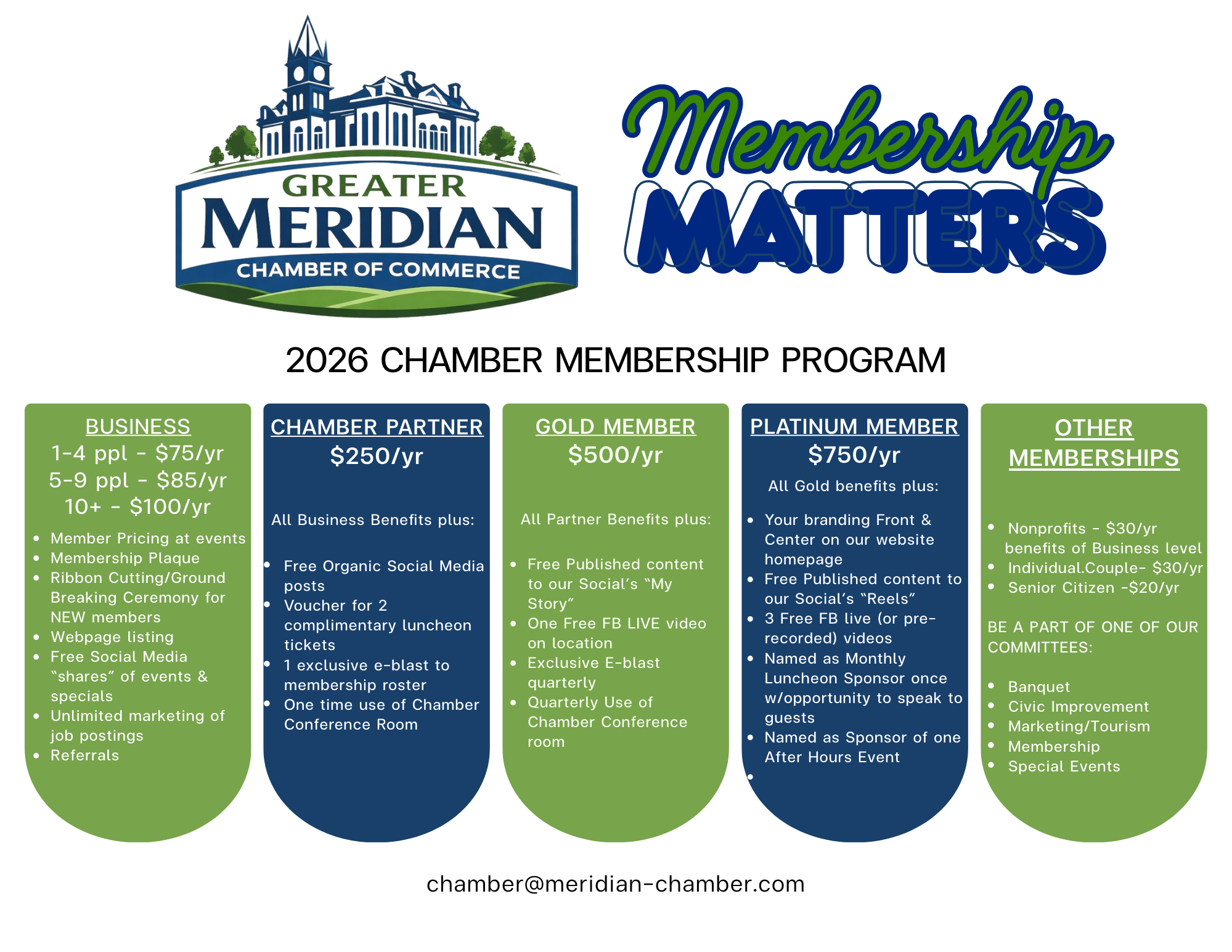 Special Events: When events are scheduled for Meridian that will bring visitors to our area, Chamber members are given the opportunity to sponsor the event as a way to advertise your business.